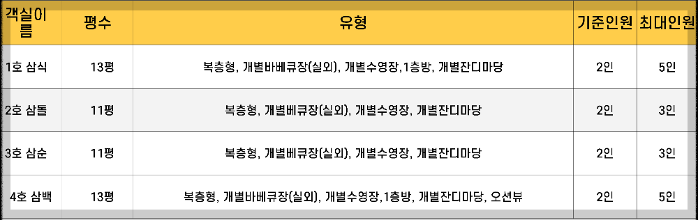 밑에 표를 클릭하시면 객실별로 상세정보를 확인하실 수 있습니다.
