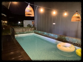 수영장의 길이는 길고 넓어서 여러 명이 즐기기에도 무리가 없으며