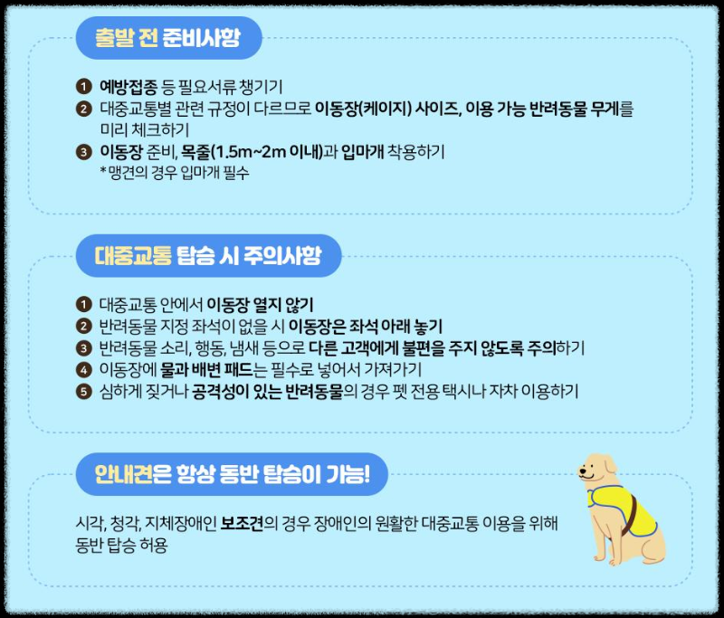※ '전용 운반 상자에 넣은 반려동물'과 '장애인 보조견'은 대중교통 탑승이 가능합니다!