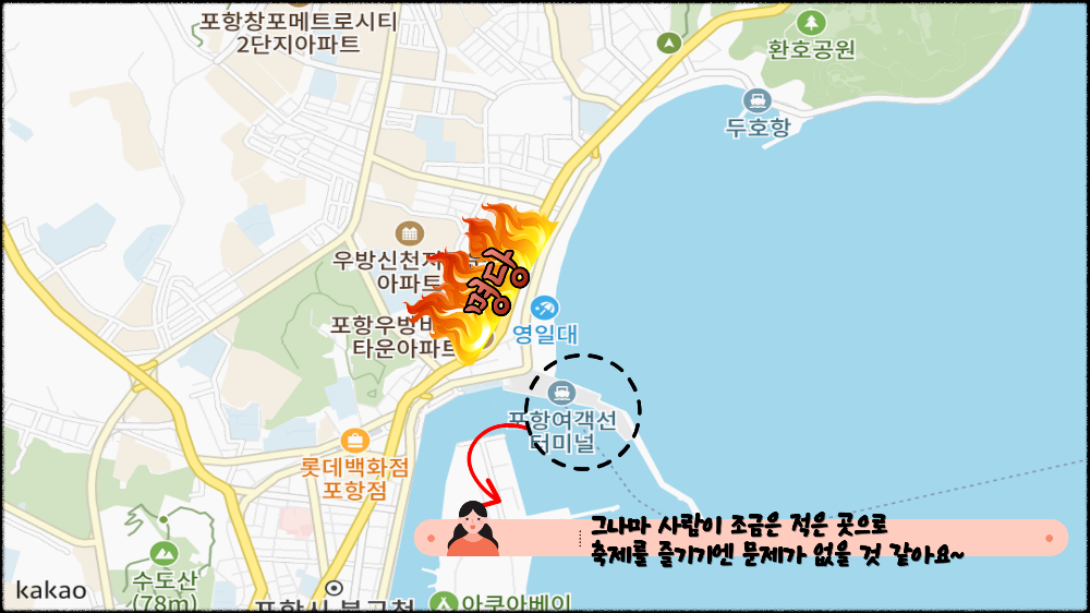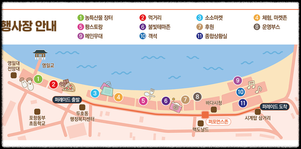 ♥ 영일대 해수욕장이 행사장 이기 때문에 당연히 해수욕장을 중심으로 해변가나 근처 식당 또는 카페가 제일 명당자리일 것입니다. 그러나 명당자리이니 만큼 사람도 그만큼 많을 거라 예상합니다.
