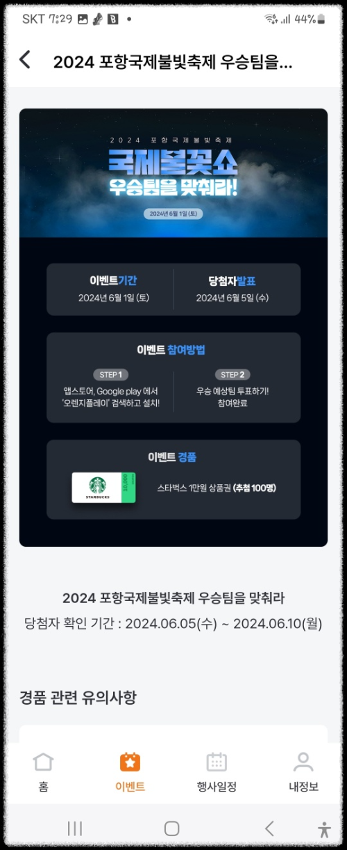 ※ 행사 당일 실시간 이벤트로 영국, 호주, 중국 3개의 팀 중에서 1등이 예상되는 팀을 정해서 맞추게 되면 100명을 추첨해서 스타벅스 기프티콘을 준다고 합니다~^^
