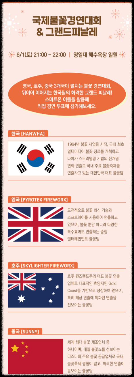 해외 유명한 불꽃팀들이 매년 참가하고 있다. 축제콘텐츠도 단순한 ‘불꽃’ 중심에서 탈피, 제작 공연과 불빛 퍼레이드 등